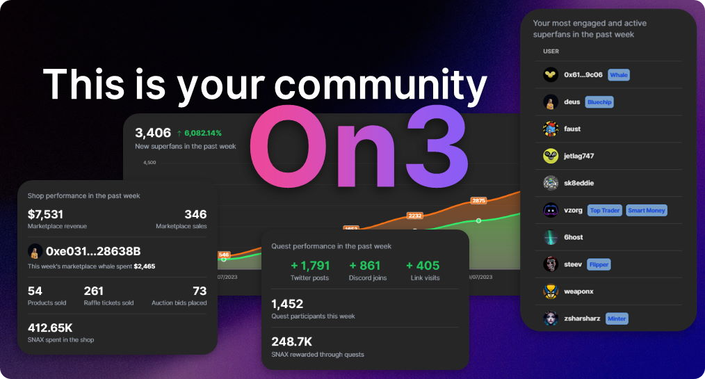 On3 is an innovative Web3 engagement and rewards platform designed to supercharge your brands growth. By identifying and understanding your community and incentivizing the right behaviors, On3 helps increase your engagement and drives more revenue.