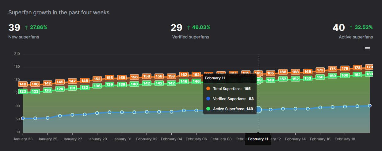 Understand how your community is performing and the growth rate of your superfans. An active superfan is a user who has logged in within the past 28 days.