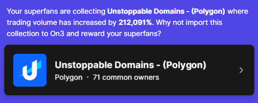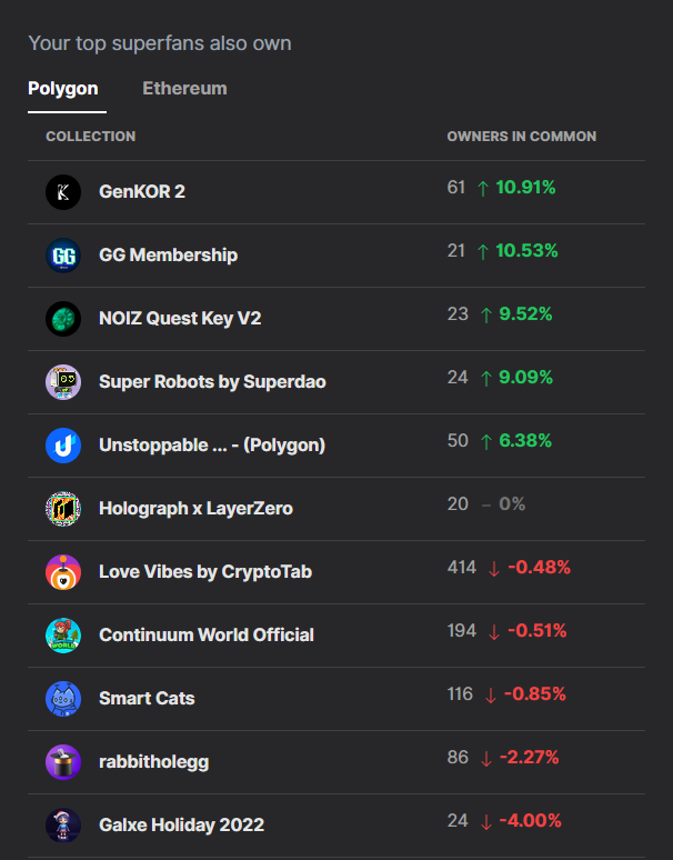 We regularly check what other digital collectibles yours superfans are collecting (and selling), other than your brands. We will also surface any collections that have significantly increased trading volumes within your superfans common communities. This can be extremely useful in identifying partnership and cross-brand collaboration opportunities, or identifying which chains your superfans are collecting on.